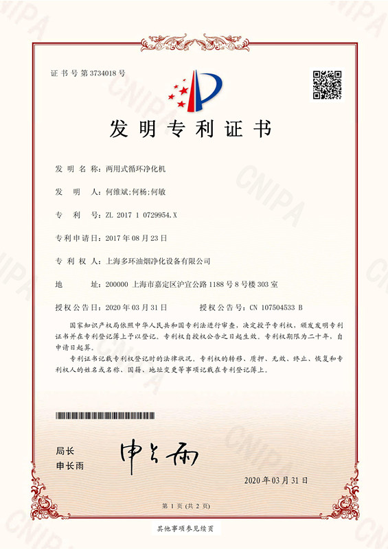 喜報!喜報!熱烈祝賀無煙管內循環油煙凈化機行業開創企業上海多環油煙凈化設備有限公司再次獲得國家發明專利授權。