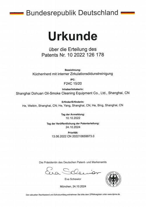 熱量祝賀上海多環公司內循環式油煙凈化灶體技術獲得德國發明專利